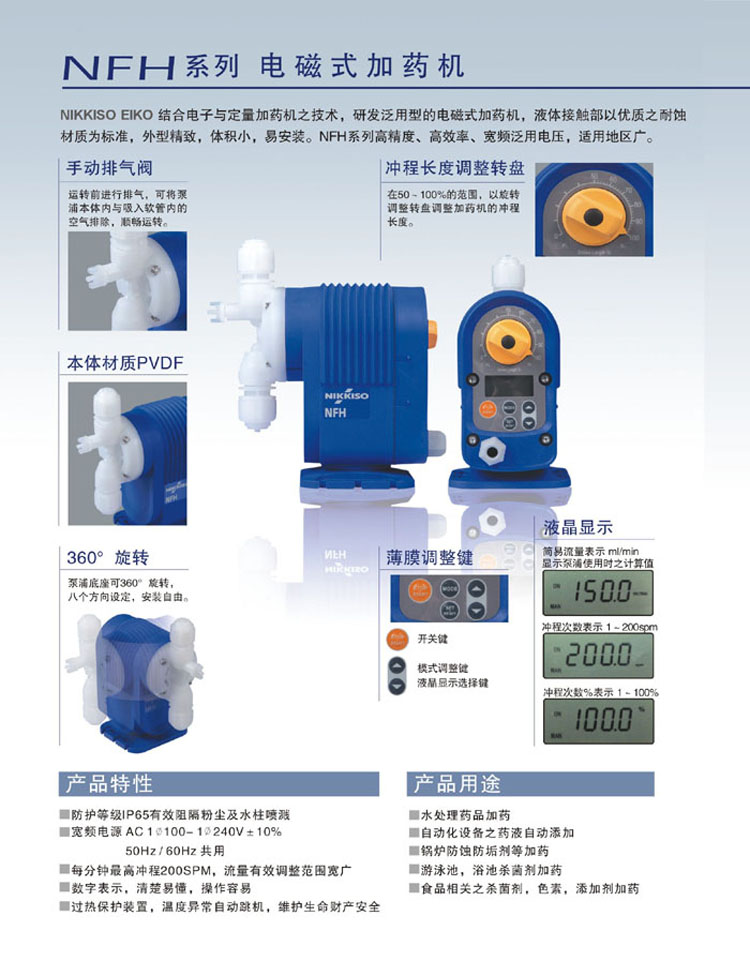• 產品描述:NIKKISO EIKO 結合電子與定量加藥機之技術,研發泛用型的電磁式加藥機,液體接觸部以優質之耐蝕材質為標準,外型精致,體積小,易安裝。NFH系列高精度、高效率、寬頻泛用電壓,適用地區廣。